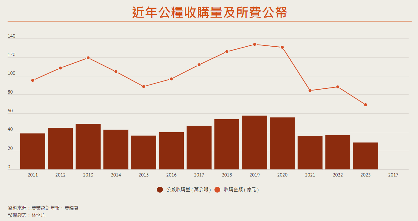 陳吉仲透露,過去公糧曾收購 100 萬公噸的乾穀,多到倉庫不夠放,政府也不敢釋出,怕打亂市場行情,擺到快過期才趕快搗碎、以每公斤 6 至 8 元價格賣給飼料業者。2019 年公糧收購支出曾超過 130 億元,倘若公糧價格再漲,近年來原本種植雜糧的農地將回頭種水稻,勢必又讓水稻面積增加,公糧爆倉問題將重演,水稻產業難再轉型。
