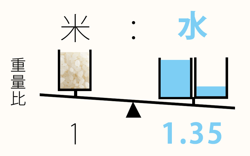 二、加水:以米:水,1:1.35的比例(這是重量比而非容積比喔,所以請勤勞一點準備小小秤子吧,但是如果以量米杯的體積來粗抓的話,大約是1:1.25),量取適當的水加入洗淨的白米中。可依不同品種的特性略微增減。