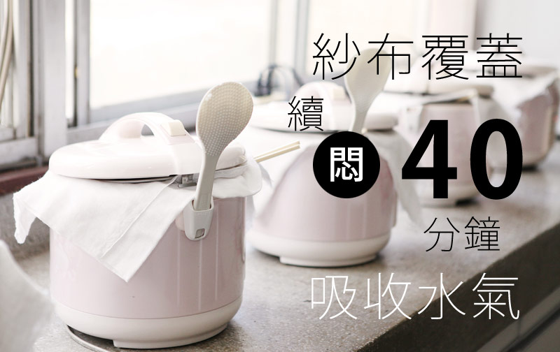 六、吸收水氣:攪拌後,記得用紗布覆蓋在鍋面,再悶40分鐘,吸收多餘水分。煮飯時會有很多水氣累積在鍋蓋上,如果沒有用紗布吸收,水氣滴到飯裡會變得糊糊的。